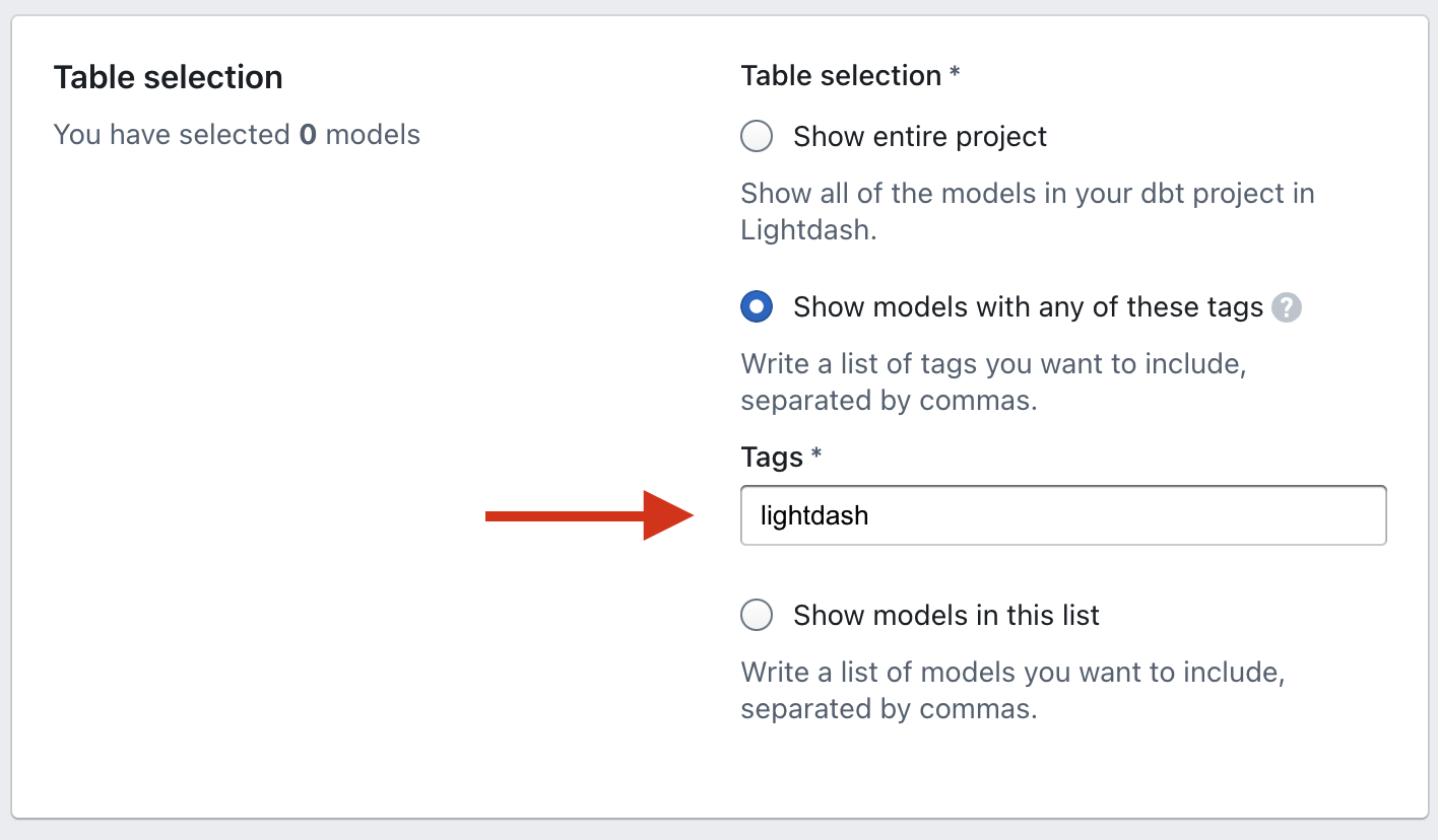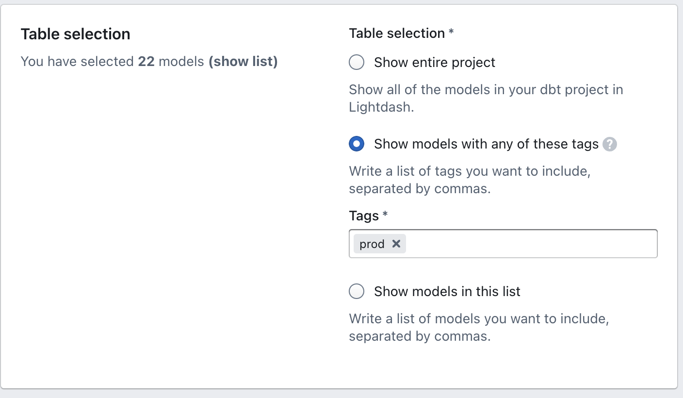 - Show models with any of these tags: This option depends on dbt tags. If you're not familiar with dbt tags, we'd recommend checking them out (they're really handy for managing models!). If you already have a specific model tag (or tags) you want to limit Lightdash to using, this is where you can add them in. For example, all of our production models have the tag