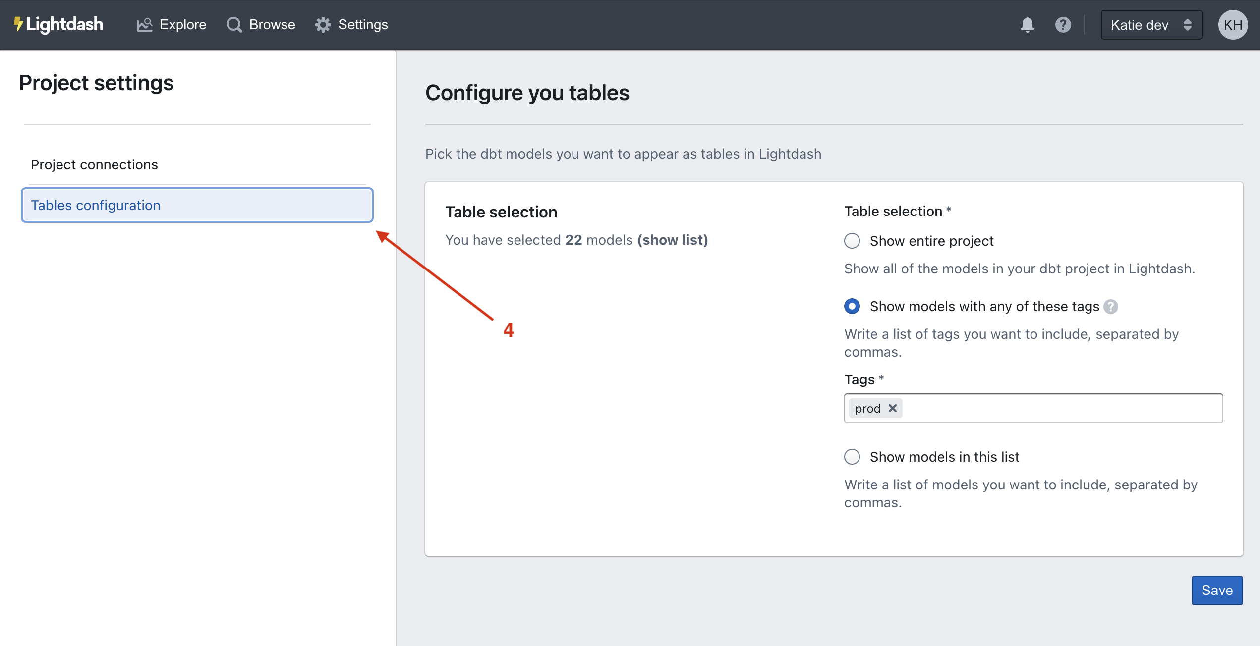 , so we've configured our Tables using that tag. - Show models in this list: If you're not keen on using tags then you can manually select the models you want to include as Tables in your Lightdash project using this option.