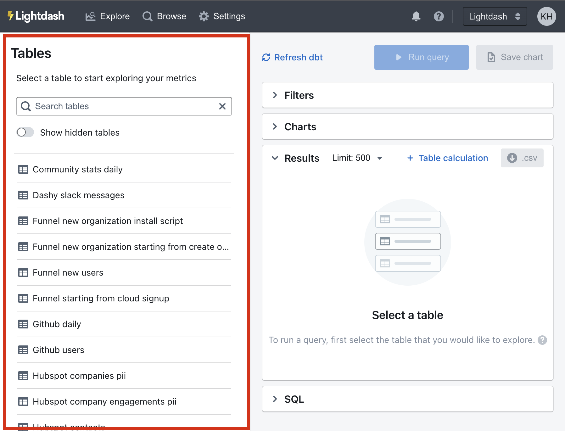 list when you open Lightdash. They're the foundation of your data exploration, the backbone to figuring out your unknowns, the art behind your charts...basically, they're pretty important.
