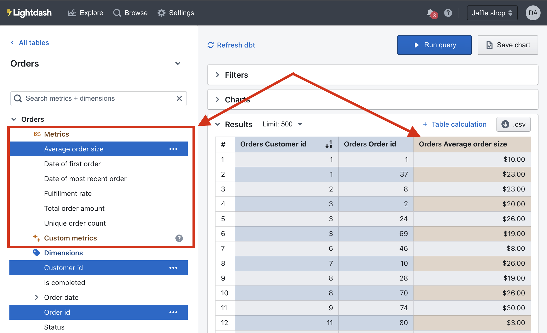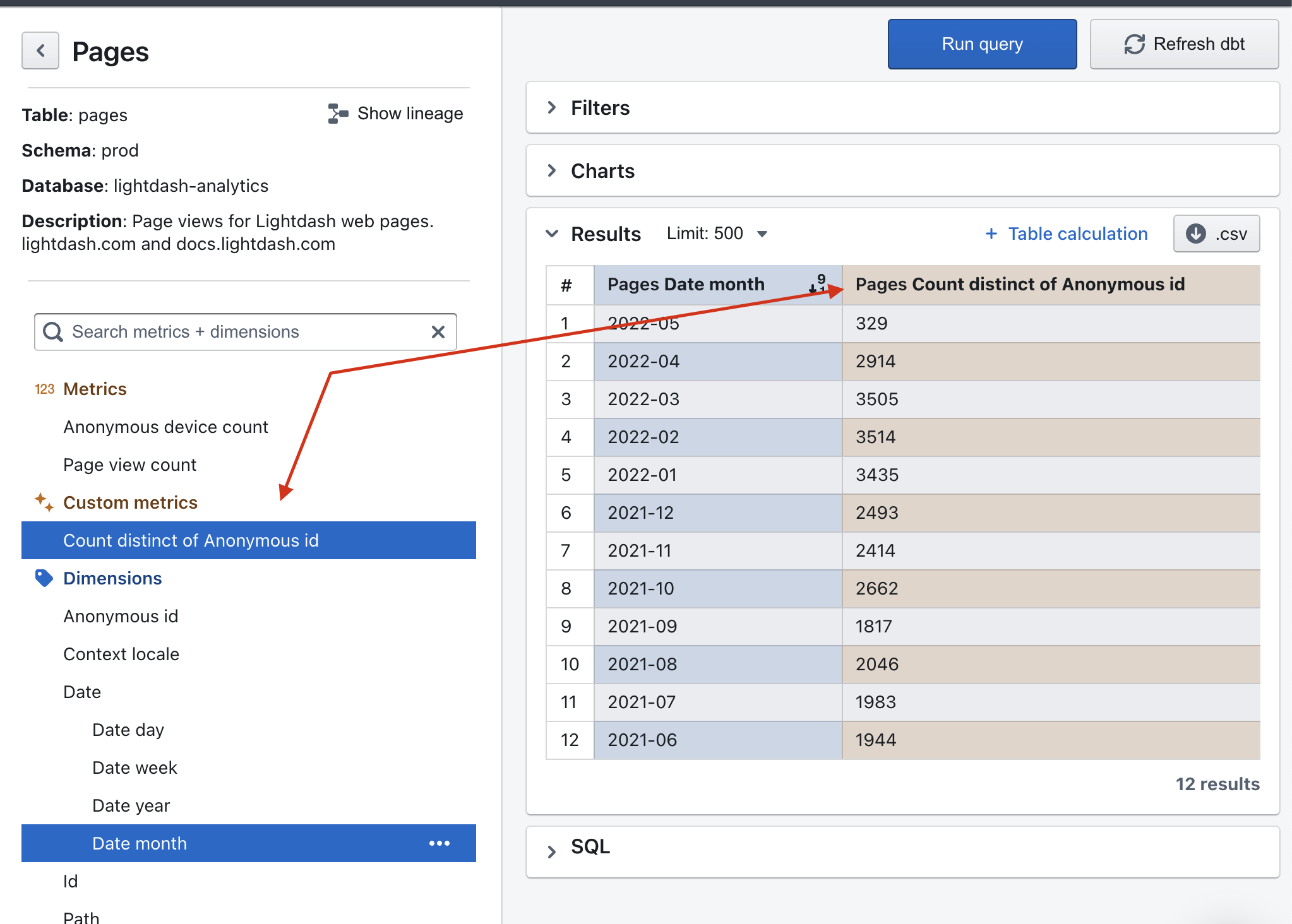 Once you've added your metrics, you can use them in Lightdash to build charts and filter results. Metrics appear in the Explore view, above dimensions and, if selected, pop us as brownish-yellow fields in your results table.