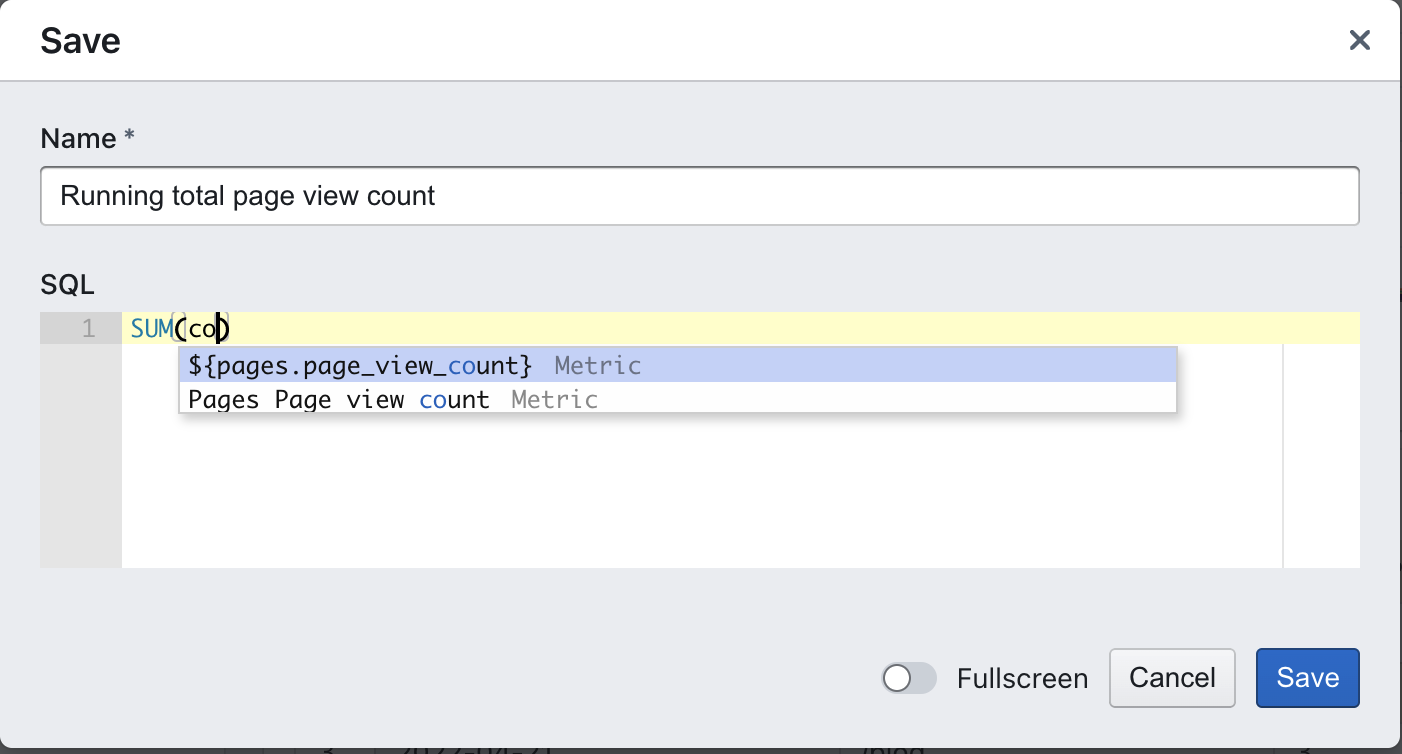 To reference the metrics and dimensions in your results table, you can either use the autocomplete, or you can manually write the full field name using the format ${table_name.field_name}