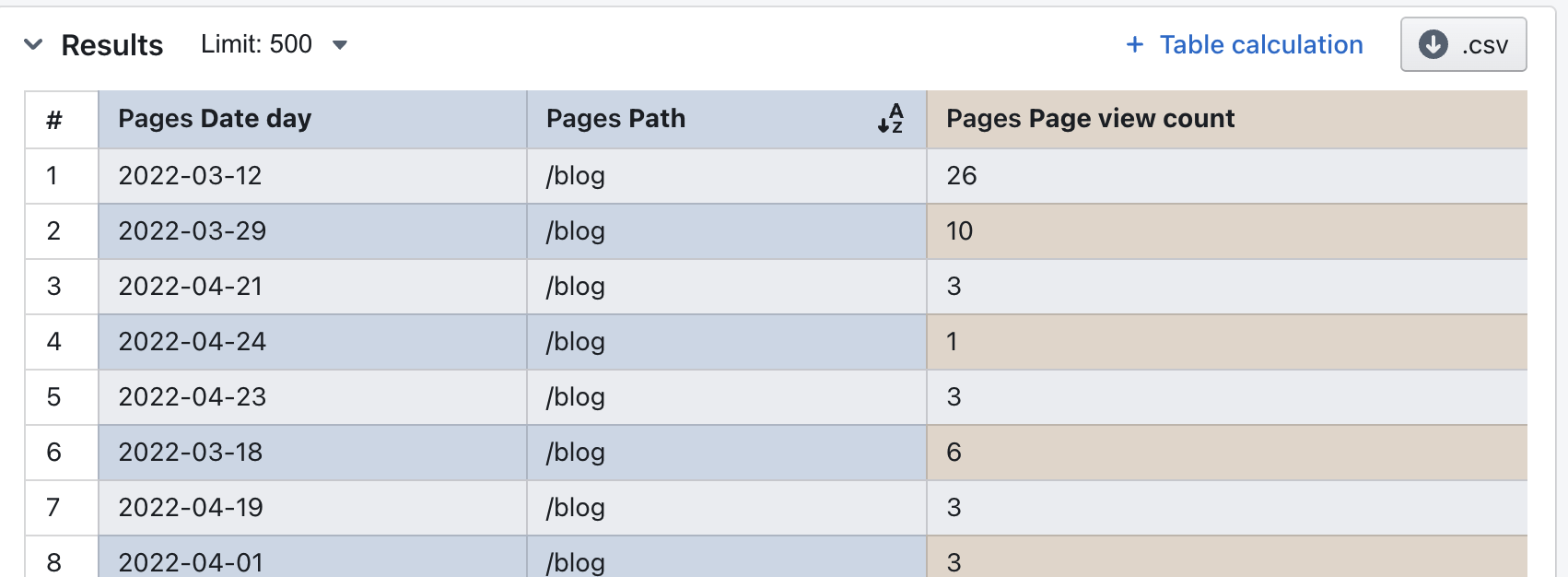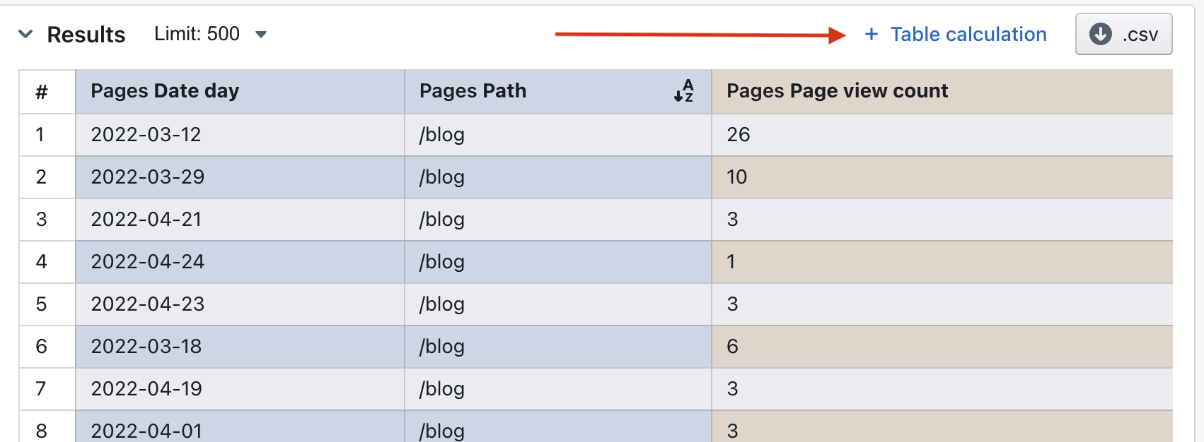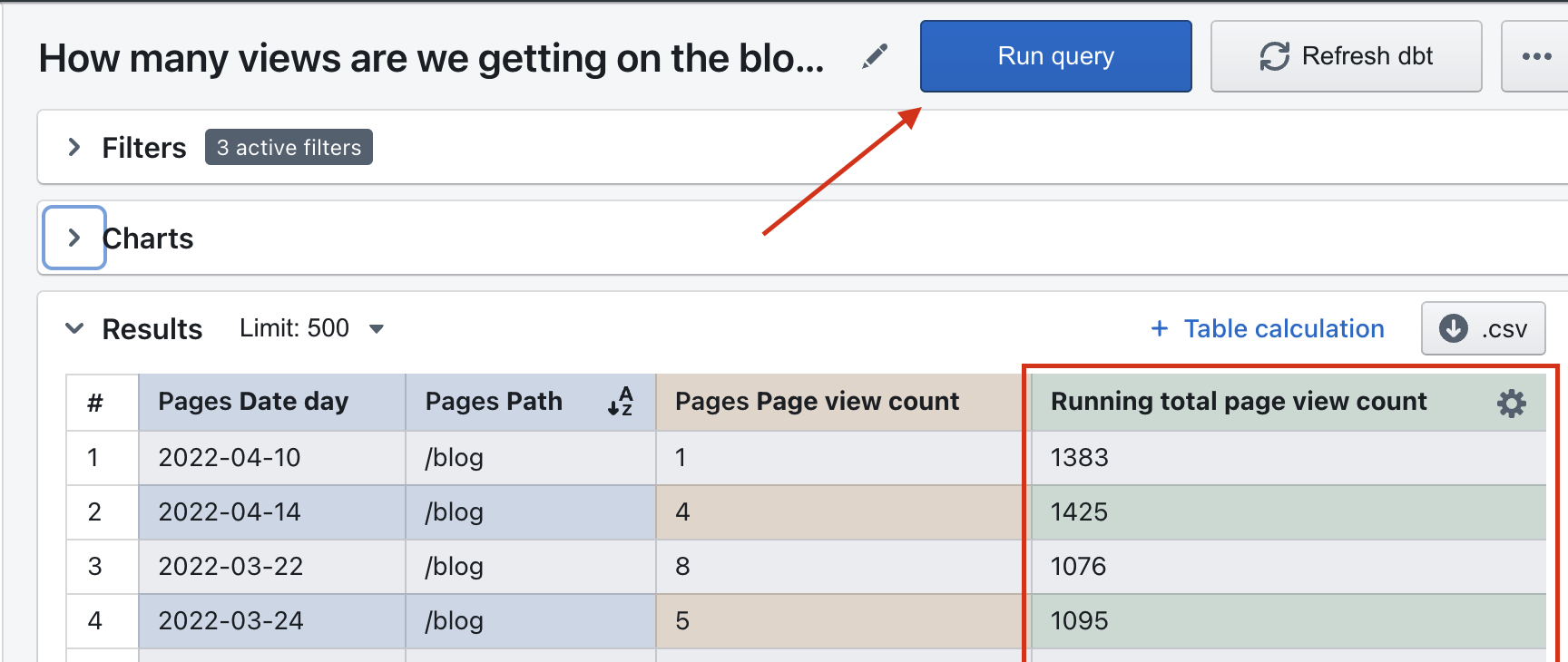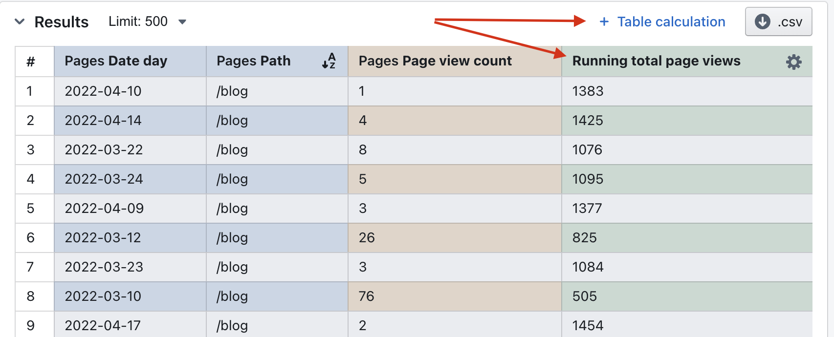 Table calculations make it easy to create metrics on the fly (for example, aggregating the data in your table over some window, or getting a running total of a column). You add table calculations in the Explore view and they appear as green columns in your results table (remember, dimensions are blue, and metrics are orange).